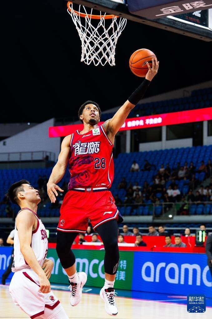 3月23日,广州朗肽海本队球员威金顿(右)在比赛中上篮。